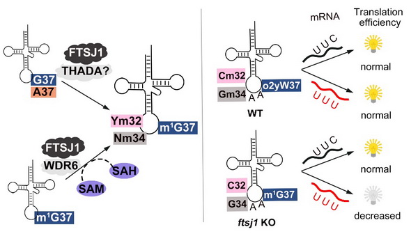 博士生李靜(現(xiàn)上??萍即髮W博士后)等在王恩多研究員和劉如娟研究員的共同指導下,首次在體外重構(gòu)了人FTSJ1的甲基轉(zhuǎn)移酶活力,證實了FTSJ1是細胞質(zhì)tRNA第32位和34位的2'-O-甲基轉(zhuǎn)移酶,并發(fā)現(xiàn)其識別底物依賴于輔助蛋白質(zhì)WDR6,還發(fā)現(xiàn)tRNAPhe反密碼子環(huán)上的修飾核苷酸之間互相影響并按嚴格的順序發(fā)生:(i)Gm34的生成依賴m1G37修飾;(ii)Cm32和Gm34影響m1G37進一步修飾成o2yW37。FTSJ1通過調(diào)控tRNA:Nm32和Nm34為核心的修飾網(wǎng)絡,調(diào)控Phe偏好UUU密碼子的翻譯,進而影響腦和神經(jīng)功能相關基因的表達。分析結(jié)果表明,人基因組中近40%的特別偏愛TTT的基因(密碼子UUU相對于UUC的使用率>80%)與腦/神經(jīng)系統(tǒng)功能相關。該項研究為揭示ftsj1突變與智力障礙之間的關系提供了新線索。