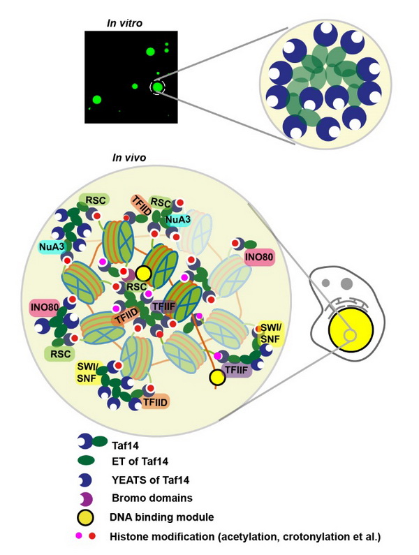 該發(fā)現不僅揭示了Taf14與多種轉錄調節(jié)因子結合的結構基礎,闡釋了Taf14通過相變富集多種轉錄機器來實現高效轉錄的新機制,而且表明了Taf14所在的YET家族蛋白可能用一種通用的機制參與轉錄調控,為YET家族蛋白(如ENL和AF9)驅動的相關疾病治療提供了新的藥物設計靶標線索。