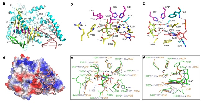 (a) CMD1-VC-5mC-DNA三元復(fù)合物的整體結(jié)構(gòu)。(b, c) CMD1的活性位點(diǎn)。(d) CMD1的表面電勢(shì)分布以及與5mc-DNA的結(jié)合方式。(e, f) CMD1與TET蛋白活性位點(diǎn)的結(jié)構(gòu)比較(綠色:CMD1;淺藍(lán)色:HsTET2;橙色:NgTET1)。