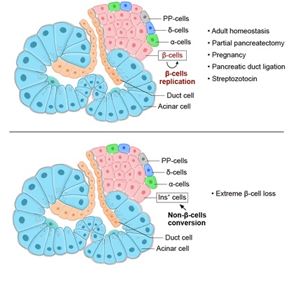 成體哺乳動物胰島中beta細(xì)胞的來源目前仍有較大爭議,主要報(bào)道了兩種不同的機(jī)制:胰島 beta細(xì)胞的自我復(fù)制和由非beta細(xì)胞生成新的beta細(xì)胞(稱為新生)。關(guān)于第一種機(jī)制,不同研究組利用遺傳譜系示蹤技術(shù)證明了beta細(xì)胞自我復(fù)制是哺乳動物出生后以及不同損傷條件下產(chǎn)生新beta細(xì)胞的主要手段。第二種機(jī)制則認(rèn)為beta可能是通過分化的非beta細(xì)胞轉(zhuǎn)分化或通過胰島干細(xì)胞或祖細(xì)胞的分化而產(chǎn)生的。