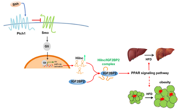 Hh信號(hào)通路的激活會(huì)誘導(dǎo)Hilnc的表達(dá),Hilnc可以直接與IGF2BP2結(jié)合從而調(diào)控PPAR信號(hào)通路,進(jìn)而影響高脂誘導(dǎo)的非酒精性脂肪肝或肥胖。