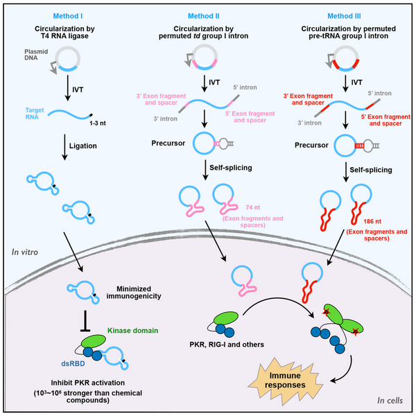 為闡明這些重要問題,陳玲玲團(tuán)隊首先比較了不同方式體外合成環(huán)形RNA的效率及免疫原性。目前已知體外合成環(huán)形RNA主要有兩種途徑:基于T4 RNA連接酶的催化直接分子內(nèi)連接成環(huán),以及基于I型內(nèi)含子核酶進(jìn)行自剪接成環(huán)。實驗結(jié)果表明,T4 RNA連接酶合成的環(huán)形RNA,包括可作為核酸適配體的環(huán)形RNA和可翻譯的環(huán)形RNA,均不會引起細(xì)胞內(nèi)天然免疫反應(yīng),然而通過兩種不同I型內(nèi)含子T4 bacteriophage和Anabeana自剪接形成的環(huán)形RNA均能夠引起細(xì)胞內(nèi)天然免疫反應(yīng)。