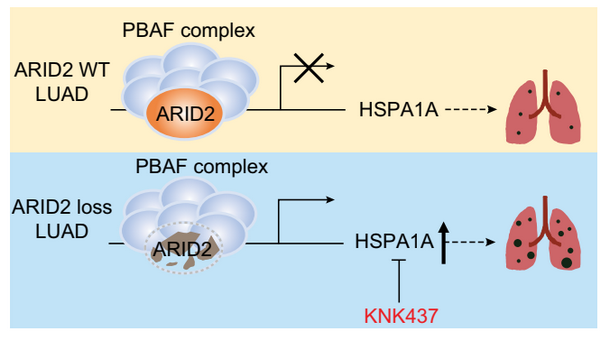 研究人員發(fā)現(xiàn)在人和小鼠肺腺癌發(fā)生發(fā)展過程中,ARID2表達(dá)水平會逐漸降低。利用基于KrasG12D的原發(fā)肺癌小鼠模型發(fā)現(xiàn),敲除ARID2會顯著加速肺腺癌的惡性進展,提示ARID2扮演抑癌基因的角色。機制分析發(fā)現(xiàn),ARID2主要通過結(jié)合在HSPA1A啟動子區(qū)來抑制HSPA1A基因轉(zhuǎn)錄,從而發(fā)揮其抑癌基因的功能。研究人員進一步發(fā)現(xiàn),抑制HSPA1A可以特異性地抑制ARID2缺陷型肺腺癌的惡性進展。該研究不僅揭示ARID2是負(fù)向調(diào)控肺腺癌惡性進展的重要基因,而且提示HSPA1A有望成為ARID2缺陷型肺腺癌的潛在治療靶標(biāo)。