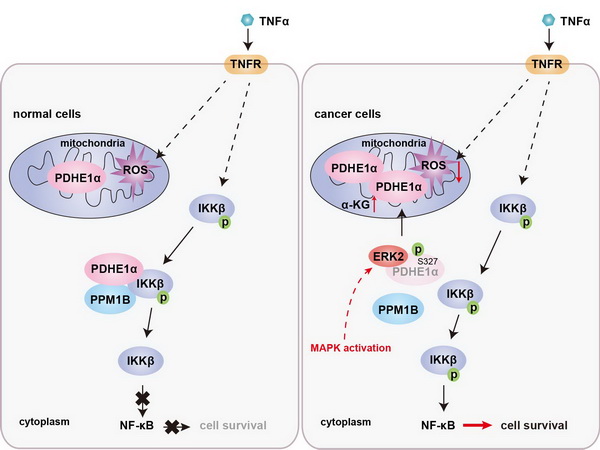 丙酮酸脫氫酶復合物在線粒體中催化丙酮酸轉(zhuǎn)化為乙酰輔酶A,橋接糖酵解與三羧酸循環(huán)代謝。楊巍維組的最新合作研究發(fā)現(xiàn)丙酮酸脫氫酶復合物E1組分α亞基(PDHE1α)存在豐富的胞質(zhì)定位;胞質(zhì)PDHE1α通過促進磷脂酶PPM1B對IKKβ S177/181(IKKβ激活的關(guān)鍵磷酸化位點)的去磷酸化削弱了NF-κB信號通路的激活,增強了炎癥因子及細胞毒性T淋巴細胞(CTLs)誘導的腫瘤細胞死亡。然而,MAPK等致癌信號(oncogenic signaling)的激活,導致胞質(zhì)PDHE1α S327位點被ERK2磷酸化并轉(zhuǎn)位到線粒體;胞質(zhì)PDHE1α水平的下降恢復了NF-κB信號通路的活化;同時,線粒體PDHE1α的增多提升了α-酮戊二酸的含量,并促進炎癥因子刺激下腫瘤細胞的ROS解毒。NF-κB的活化和ROS的清除共同促進了腫瘤細胞在炎癥因子刺激下的存活,增強了腫瘤細胞對CTLs的耐受性,最終促進了腫瘤的免疫逃逸和抗PD-1治療的耐藥性。