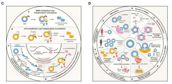 近年來,也有研究表明一部分環(huán)形RNA能夠作為翻譯模版編碼功能性小肽,從而調(diào)控?zé)嵝菘藨?yīng)激、腫瘤細胞遷移侵襲等生物學(xué)過程(圖C)。值得一提的是,環(huán)形RNA的穩(wěn)定性和特殊的免疫原性,使得環(huán)形RNA具有很好的轉(zhuǎn)化應(yīng)用場景。該論文總結(jié)了環(huán)形RNA一系列轉(zhuǎn)化應(yīng)用場景:如作為RNA適配體、miRNA和蛋白質(zhì)的分子海綿、反義RNA、調(diào)控細胞內(nèi)天然免疫反應(yīng)、蛋白質(zhì)翻譯載體及疾病相關(guān)分子標志物等,為進一步改造和利用環(huán)形RNA提供新思路(圖D)。