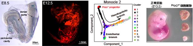 圖示:(左一)胚胎期E8.5天血管形成期間Procr的表達(dá)(藍(lán)色標(biāo)記)。(左二)胚胎期E12.5天由Procr+ 祖細(xì)胞及后代形成的血管網(wǎng)絡(luò)(紅色熒光標(biāo)記)。(右二)發(fā)育路徑分析展示Procr+祖細(xì)胞分化為成熟的內(nèi)皮和血液細(xì)胞。(右一)Procr+祖細(xì)胞的敲除阻礙血管、血液的形成,嚴(yán)重影響胚胎的正常發(fā)育。