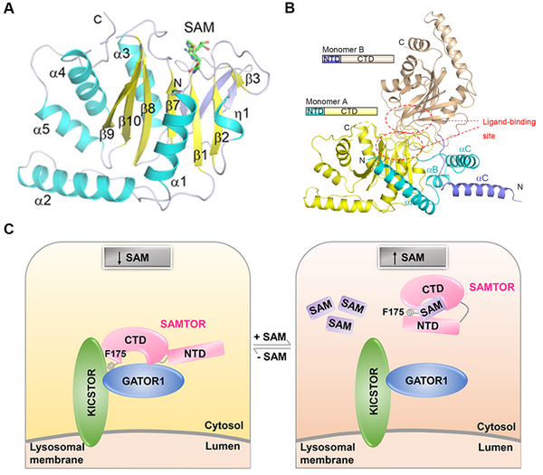 圖:SAMTOR感知SAM以調(diào)控mTORC1活性的分子機(jī)制。(A)SAMTOR的MTase結(jié)構(gòu)域結(jié)合SAM的整體結(jié)構(gòu);(B)Apo形式的全長dSAMTOR V66W/E67P突變體同源二聚體的整體結(jié)構(gòu);(C)SAMTOR感知并結(jié)合SAM,通過構(gòu)象變化發(fā)揮分子開關(guān)功能、調(diào)控其與GATOR1-KICSTOR相互作用的分子機(jī)制。