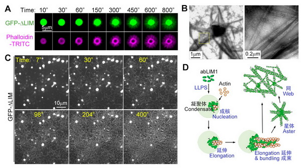 (A) ΔLIM凝聚體作為微絲組織中心逐漸形成微絲(紫紅)星狀體;(B) 星狀體的透射電鏡圖片。方框內(nèi)的區(qū)域被放大,以展示其放射出的微絲束。(C) ΔLIM誘導(dǎo)致密的微絲束網(wǎng)的形成;(D) abLIM1發(fā)揮功能的模式圖。