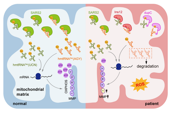 本研究鑒定了新的導(dǎo)致線粒體HUPRA綜合征的SARS2點突變,擴展了SARS2缺陷相關(guān)的臨床表型;利用分子、結(jié)構(gòu)、細胞和遺傳學(xué)方法與技術(shù)手段,系統(tǒng)解析了SARS2點突變對于SARS2結(jié)構(gòu)與功能、線粒體翻譯及功能的綜合性影響,揭示hmtRNASer(AGY)選擇性降解導(dǎo)致其穩(wěn)態(tài)水平顯著降低是SARS2基因突變導(dǎo)致線粒體疾病的致病機制,顯著加深了我們對mt-aaRS功能缺陷相關(guān)線粒體疾病分子機理的認識。本研究為此類疾病的臨床診斷、疾病干預(yù)與治療策略開發(fā)提供了理論基礎(chǔ)。