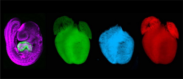 圖:(i)小鼠胚胎中心肌細(xì)胞表達(dá)synNotch配體(綠色),內(nèi)皮細(xì)胞表達(dá)synNotch受體(紫色)。(ii-iv)新生小鼠心臟中,表達(dá)synNocth配體的心肌細(xì)胞(綠色,ii),利用鄰近細(xì)胞遺傳標(biāo)記技術(shù)捕捉實(shí)時(shí)接觸心肌細(xì)胞的內(nèi)皮細(xì)胞(藍(lán)色,iii),利用鄰近細(xì)胞遺傳示蹤技術(shù)追蹤接觸過心肌細(xì)胞的內(nèi)皮細(xì)胞(紅色,iv)。