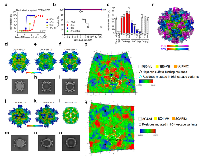 a-b, CVA16單抗8C4和9B5對CVA16活病毒的中和活性(a)及體內治療效果(b)。c, 9B5而非8C4的預處理可以劑量依賴地抑制CVA16活病毒對宿主細胞的吸附。d-f, j-l CVA16-9B5(d-f)及CVA16-8C4(j-l) 復合體的系列冷凍電鏡結構。C1和C2中CVA16為緊湊構象,C3中CVA16為膨脹構象。g-i, m-o, CVA16-9B5(g-i)和CVA16-8C4(m-o)三種狀態(tài)電鏡密度圖的中央切片。顯示C2和C3狀態(tài)CVA16腔內不含病毒RNA。p, 9B5在病毒衣殼上的結合足跡。q, 8C4在病毒衣殼上的結合足跡。r, 疊加CVA16-9B5-C1和CVA16-8C4-C1的冷凍電鏡結構,顯示8C4和9B5識別不同的、不重疊的表位。