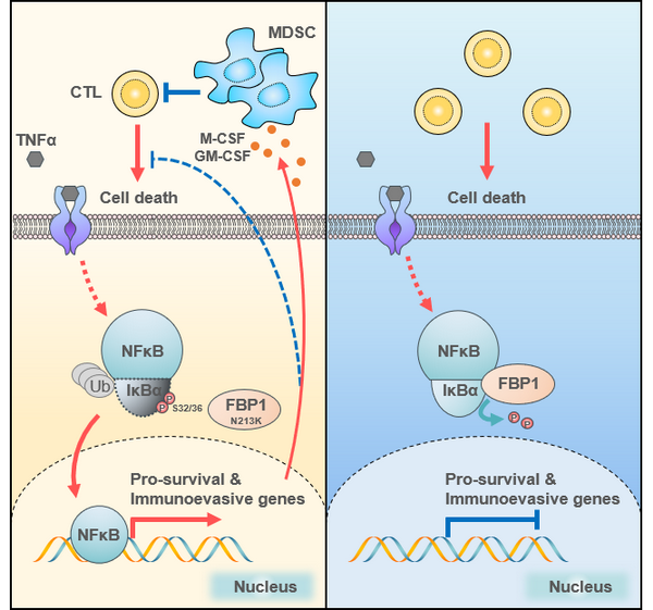 該工作揭示了代謝酶FBP1能夠行使蛋白磷酸酶的新功能,明確了IκBα是FBP1去磷酸化的蛋白質(zhì)底物,并確立了FBP1介導的IκBα去磷酸化在結(jié)直腸腫瘤發(fā)生中的關(guān)鍵作用及其機制。