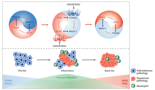 結(jié)合轉(zhuǎn)錄組數(shù)據(jù)的無監(jiān)督聚類以及動態(tài)網(wǎng)絡(luò)標(biāo)志物(DNB)分析發(fā)現(xiàn)肺腺鱗癌可以分為三個分子亞型,其中炎癥亞型是接近臨界點的關(guān)鍵中間狀態(tài)。在腺鱗癌轉(zhuǎn)分化過程中四個譜系轉(zhuǎn)錄因子NKX2-1、FOXA2、SOX2和TP63形成相互拮抗的調(diào)控網(wǎng)絡(luò),其失衡會經(jīng)過免疫細(xì)胞高度浸潤的狀態(tài)最終實現(xiàn)腺鱗癌轉(zhuǎn)分化。
