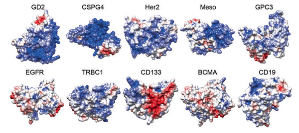 (臨床中常見的10種CAR的設(shè)計。其中藍(lán)色為正電荷基團(tuán),紅色為負(fù)電荷基團(tuán)。)