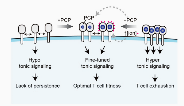 近期研究發(fā)現(xiàn),多數(shù)實體腫瘤CAR受體在無腫瘤抗原刺激時,仍然會產(chǎn)生一種持續(xù)的基底信號,而這種基底信號會持續(xù)刺激CAR-T細(xì)胞,導(dǎo)致后者功能耗竭。同時,基底信號的過度不足也會影響CAR-T細(xì)胞的持續(xù)和療效。因此,了解基底信號形成和維持的機制是解決上述難題的關(guān)鍵。