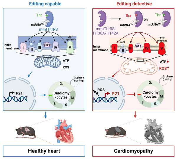 為了回答線粒體是否需要翻譯保真性機制,研究人員首先通過體外生化實驗證明,小鼠線粒體蘇氨酰-tRNA合成酶(Tars2)具有編校Ser-tRNAThr的能力,且H138以及H142是Tars2的編?;钚灾行?通過CRISPR/Cas9方法,構建了含有編校活性中心雙突變(H138A/H142A)的NIH3T3細胞系(NIH3T3-MU),發(fā)現(xiàn)H138A/H142A突變使線粒體tRNAThr誤接載Ser,形成的Ser-tRNAThr有效地被線粒體翻譯機器作為原料利用,在線粒體基因組編碼的蛋白質中含有大量的Thr被Ser誤摻的肽段,導致呼吸鏈復合物活力下調、氧化呼吸能力減弱等。進一步研究發(fā)現(xiàn),線粒體翻譯保真性缺失導致細胞內(nèi)氧化應激,通過上調p53調控Cdk2-Cyclin E相互作用,將NIH3T3-MU細胞周期阻滯在G0/G1期;用抗氧化劑N-乙酰半胱氨酸(NAC)可以有效地解除細胞周期阻滯。研究者還構建了小鼠心肌細胞HL-1的H138A/H142A突變細胞系(HL-1-MU),在HL-1-MU細胞中同樣觀察到誤氨基?;p傷的線粒體翻譯、氧化應激、細胞周期阻滯、呼吸鏈復合物活力下調、氧化呼吸能力減弱等現(xiàn)象,提示了不同細胞類型對于線粒體翻譯保真性失調具有類似的細胞效應。通過CRISPR/Cas9方法,構建了H138A/H142A全身突變小鼠模型,發(fā)現(xiàn)H138A/H142A全身突變小鼠胚胎致死。進一步獲得了心肌細胞特異性H138A/H142A突變小鼠,發(fā)現(xiàn)心臟功能損傷、心肌纖維化等表型;通過分離小鼠原代心肌細胞,觀察到心肌細胞氧化應激以及細胞周期阻滯等現(xiàn)象。