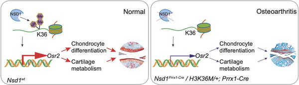左圖:組蛋白H3K36甲基轉移酶NSD1在軟骨細胞中上調(diào)Osr2基因的表達,有利于軟骨細胞分化與關節(jié)軟骨穩(wěn)態(tài)