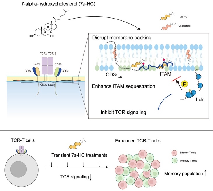 5月16日,國(guó)際學(xué)術(shù)期刊Cell Chemical Biology在線發(fā)表了中國(guó)科學(xué)院分子細(xì)胞科學(xué)卓越創(chuàng)新中心(生物化學(xué)與細(xì)胞生物學(xué)研究所)許琛琦研究組聯(lián)合上海科技大學(xué)王皞鵬研究組與中國(guó)科學(xué)院生物物理所婁繼忠研究組的最新合作研究成果:“Transient hydroxycholesterol treatment restrains TCR signaling to promote long-term immunity”(Featured Article)。該研究發(fā)現(xiàn)天然的甾醇代謝物7a-羥基膽固醇(7a-hydroxycholesterol,7a-HC)可以直接抑制TCR(T Cell Receptor)信號(hào)轉(zhuǎn)導(dǎo);利用該功能,作者證明7a-HC短期處理能降低TCR-T細(xì)胞基底信號(hào),增加記憶細(xì)胞比例,從而提高免疫治療的長(zhǎng)效性。