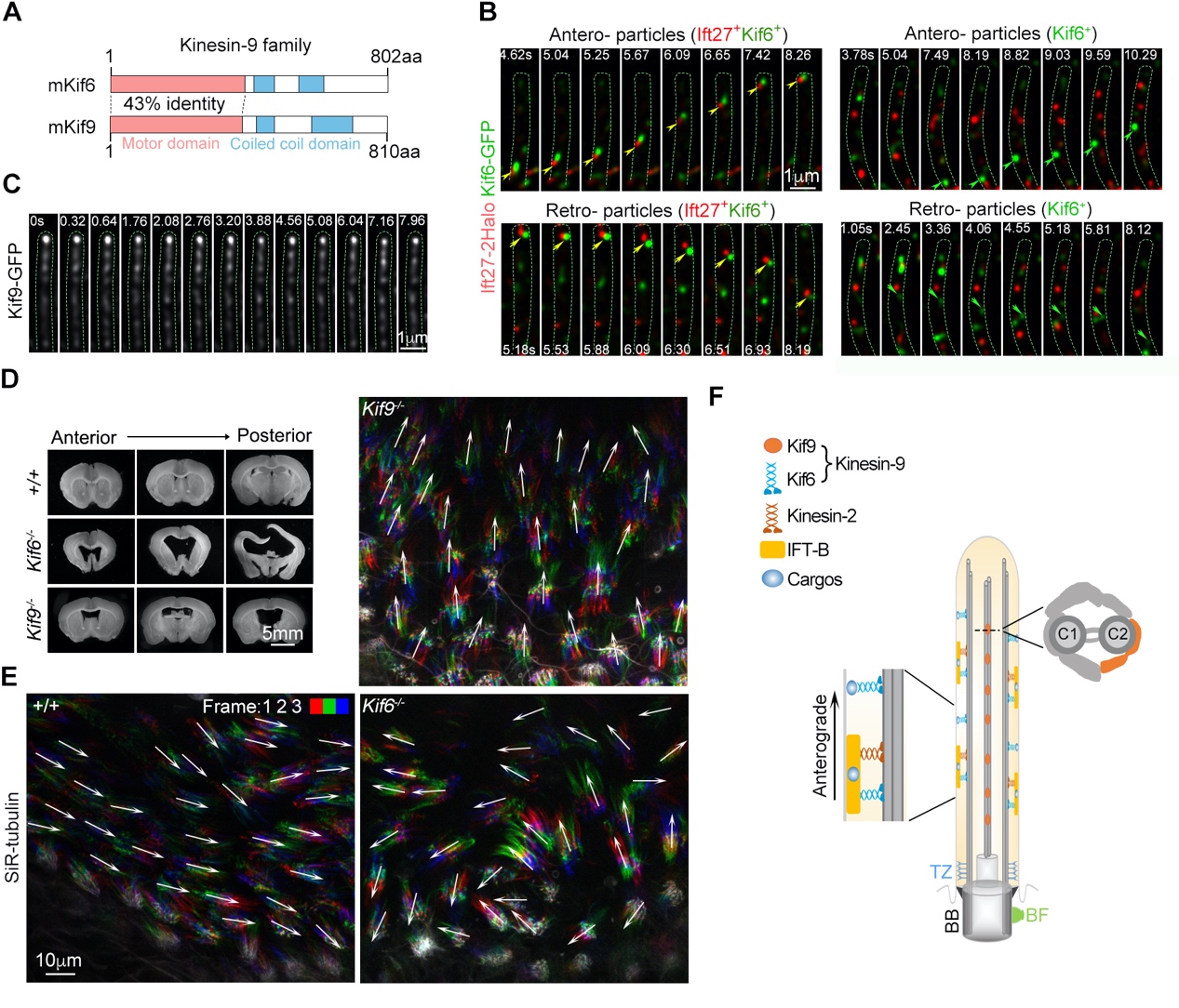 (A)鼠源Kif6和Kif9的示意圖;(B)Kif6-GFP能在腦室運(yùn)動纖毛外周微管上進(jìn)行長距離的雙向運(yùn)動,有些與Ift27顆粒共運(yùn)動(Ift27+Kif6+),有些則單獨(dú)運(yùn)動(Kif6+);(C)Kif9-GFP在中央器上進(jìn)行短距離的晃動;(D)大腦切片觀察腦室擴(kuò)大情況顯示Kif6敲除(Kif6-/-)小鼠出現(xiàn)嚴(yán)重的腦積水,而Kif9敲除(Kif9-/-)小鼠僅表現(xiàn)為輕微的腦積水;(E)與野生型(+/+)和Kif9敲除小鼠不同,Kif6敲除小鼠的腦室管膜上皮運(yùn)動纖毛擺動方向紊亂;(F)Kif6和Kif9在運(yùn)動纖毛的功能模式圖。
