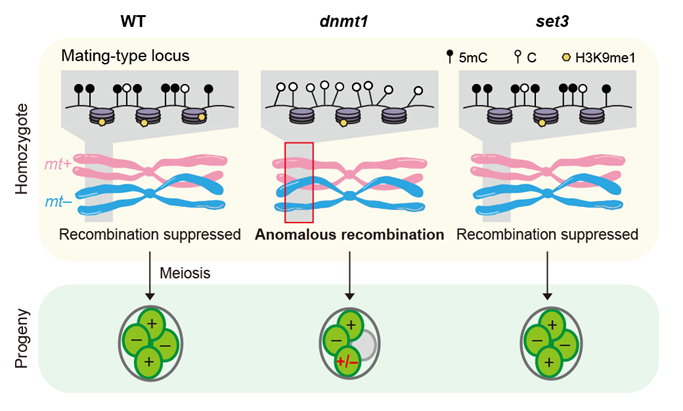 萊茵衣藻(Chlamydomonas reinhardtii)作為一種單倍體的單細(xì)胞真核綠藻,是研究有性生殖與減數(shù)分裂的重要模式生物。衣藻的性別由mating-type locus (mt) 決定,存在兩種交配型:plus與minus。MT是基因組中一段375 kb (mt+) 或211 kb (mt–) 的復(fù)雜序列,在兩種交配型之間重排。此前的研究表明,重排序列對(duì)該區(qū)域的重組抑制有所貢獻(xiàn),但并不充分,同時(shí)兩者之間的因果關(guān)系也尚不明晰。