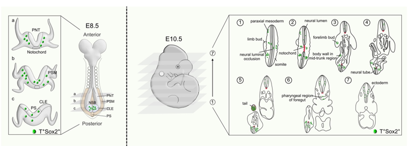 示蹤的NMPs在胚胎E8.5和E10.5的時(shí)空分布