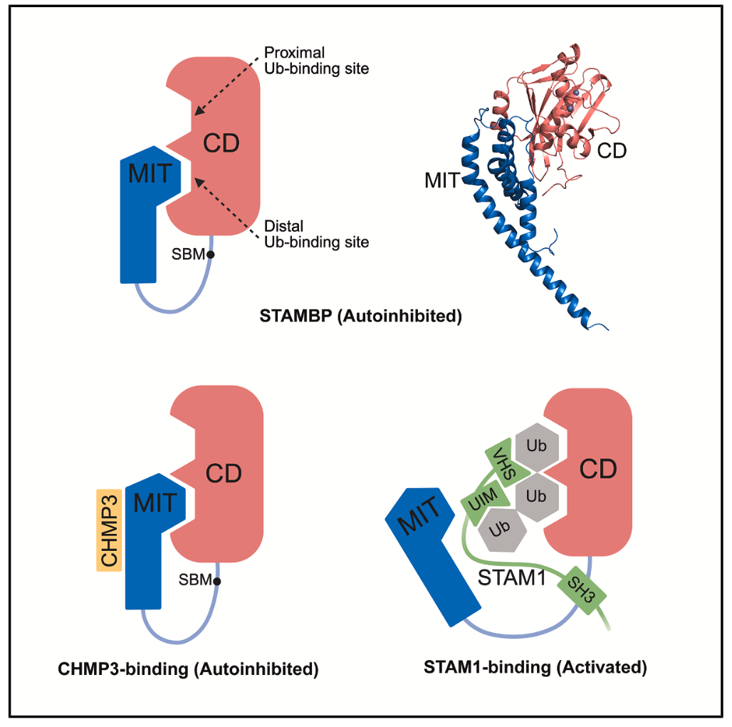去泛素化酶STAMBP是一種JAMM家族鋅離子依賴型異肽酶,能特異性催化K63連接型泛素鏈的斷裂,在ESCRT介導(dǎo)的細(xì)胞表面受體運(yùn)輸中發(fā)揮關(guān)鍵功能。STAMBP由多個(gè)結(jié)構(gòu)域構(gòu)成,其N端的MIT結(jié)構(gòu)域可以與ESCRT-III復(fù)合體組分CHMP蛋白結(jié)合,其C端的MPN結(jié)構(gòu)域(CD)發(fā)揮催化功能,而中間的連接區(qū)包含一個(gè)結(jié)合ESCRT-0組分STAM蛋白的SBM基序。先前的研究基于對截短體蛋白的結(jié)構(gòu)與生化分析,揭示了STAMBP通過SBM基序與STAM相互作用,從而增強(qiáng)CD去泛素化酶活性的分子機(jī)制,但對全長蛋白活性的調(diào)控機(jī)制尚不清楚。