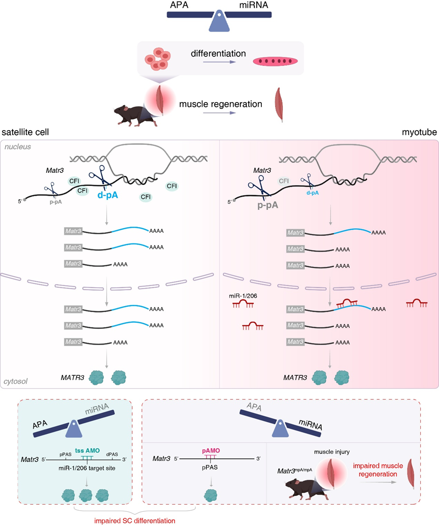為驗證該機制的生理意義,研究人員聚焦于肌肉疾病相關的核基質蛋白Matr3,發(fā)現(xiàn)其表達受到APA與myomiR的雙重協(xié)同調控。破壞這種協(xié)同調控會導致Matr3表達異常,進而不利于肌肉干細胞的正常分化。進一步,結合Matr3近端多聚腺苷酸化位點突變的小鼠模型,研究人員在動物水平上闡明了APA介導的3′UTR縮短在肌肉發(fā)育中的生理功能。值得注意的是,在杜氏肌營養(yǎng)不良癥、強直性肌營養(yǎng)不良等肌肉疾病中均存在APA紊亂現(xiàn)象,提示APA異??赡軈⑴c肌肉疾病的發(fā)病過程。這一發(fā)現(xiàn)為理解肌肉疾病的分子機制提供了新的研究視角。