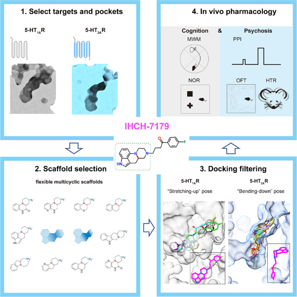 “大家想象一下轉(zhuǎn)動(dòng)鑰匙的動(dòng)作,我們手握的是匙柄,在靶點(diǎn)內(nèi)部,其實(shí)給匙柄的空間很小。”汪勝說,能做改變的是匙身。多學(xué)科聯(lián)合、多年攻關(guān),團(tuán)隊(duì)設(shè)計(jì)出多靶點(diǎn)分子IHCH-7179,結(jié)合血清素2A時(shí),它“彎折向下”,好像做出了“關(guān)”的動(dòng)作,從而壓制精神病患的躁狂與幻覺癥狀;而遇到血清素1A時(shí),它“舒展向上”,就像是做“開門”那般,激活此類型受體,從而起到改善精神病患認(rèn)知功能的作用。