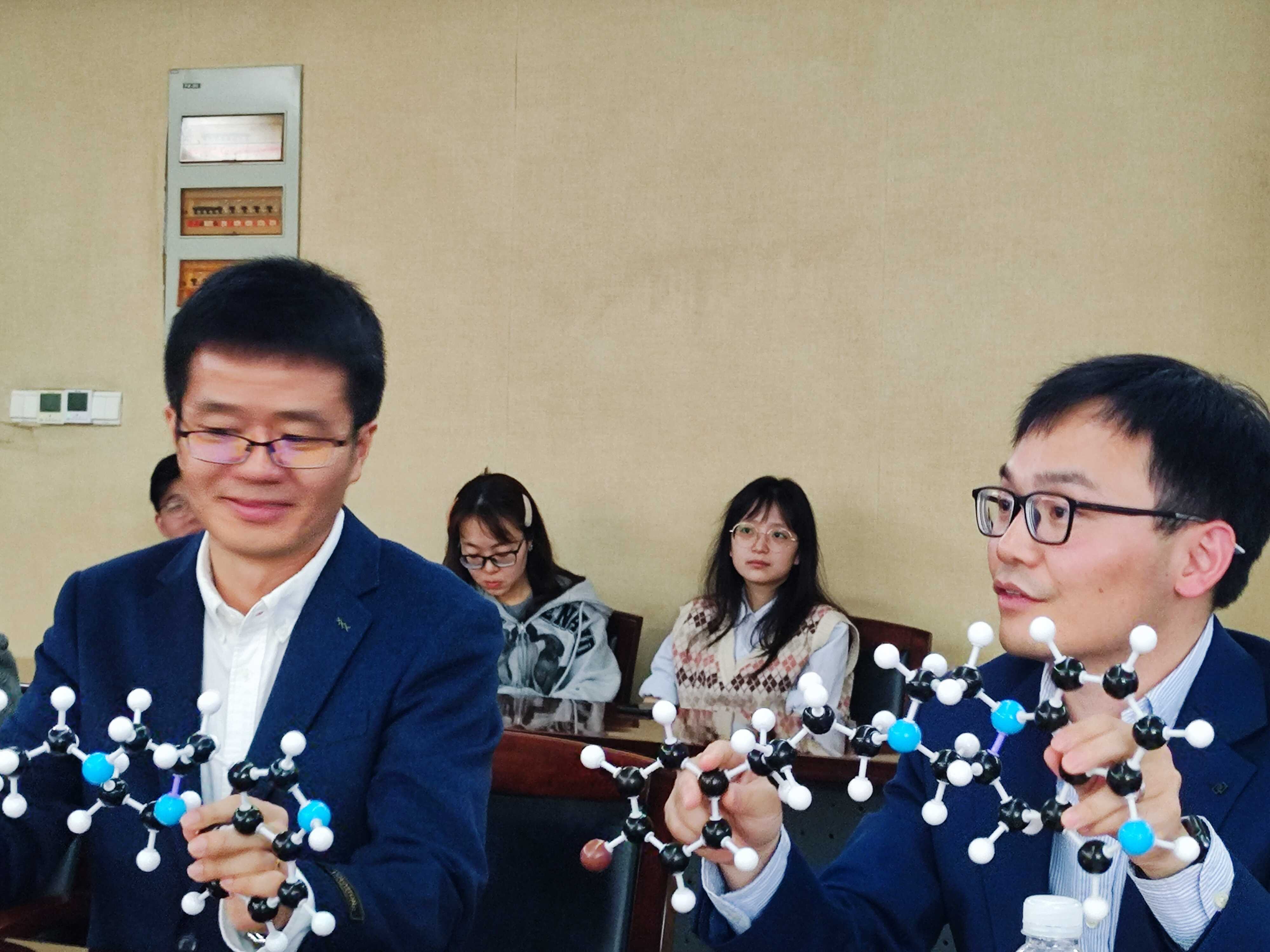 研究員汪勝(右)講解多靶點藥物設計原理