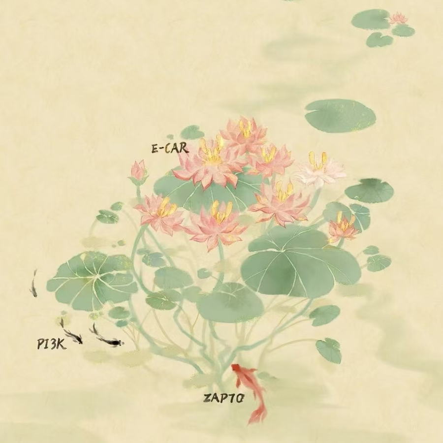 許琛琦學(xué)生畫的科普?qǐng)D:E-CAR胞內(nèi)段相分離,仿佛睡蓮的根莖交錯(cuò)纏繞。吸引來(lái)的小魚代表免疫突觸招募了各種下游信號(hào)分子,介導(dǎo)T細(xì)胞的免疫應(yīng)答反應(yīng)