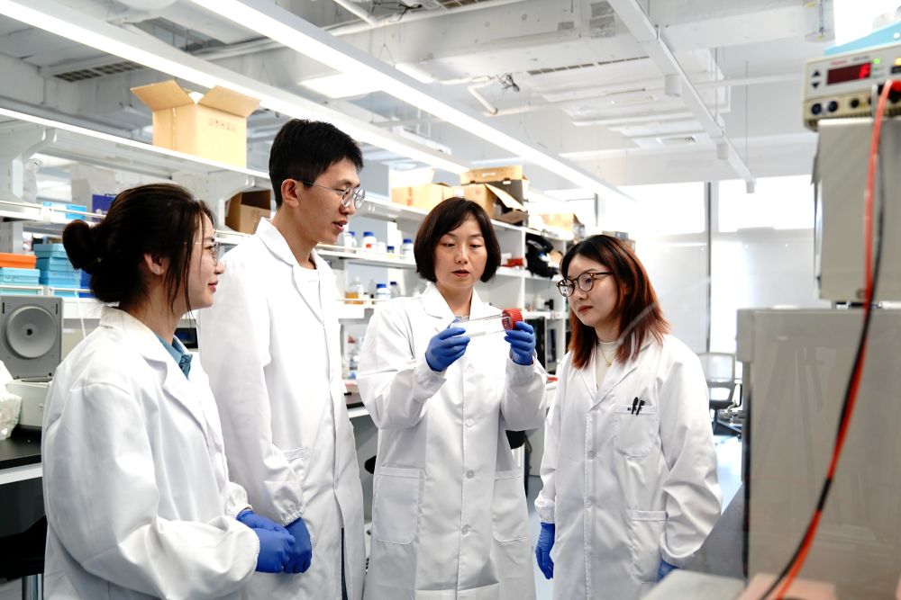 7月24日,陳玲玲研究員(右二)和團(tuán)隊(duì)成員張宇瑤(左一)、潘宇航(左二)、單琳(右一)在實(shí)驗(yàn)室商量工作。?