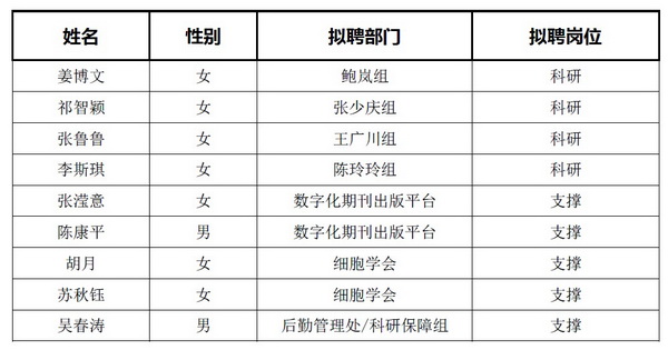 經(jīng)中國科學(xué)院分子細(xì)胞科學(xué)卓越創(chuàng)新中心公開招聘程序,決定擬聘用以下人員到我單位相應(yīng)部門崗位任職。按照相關(guān)人事規(guī)定,現(xiàn)予以公示,為期5個工作日,從2021年4月1日—2021年4月8日。公示期間,對擬聘人員如有異議,請于公示截止日期之前將意見發(fā)至郵箱hr@sibcb.ac.cn(請署真實(shí)姓名)。