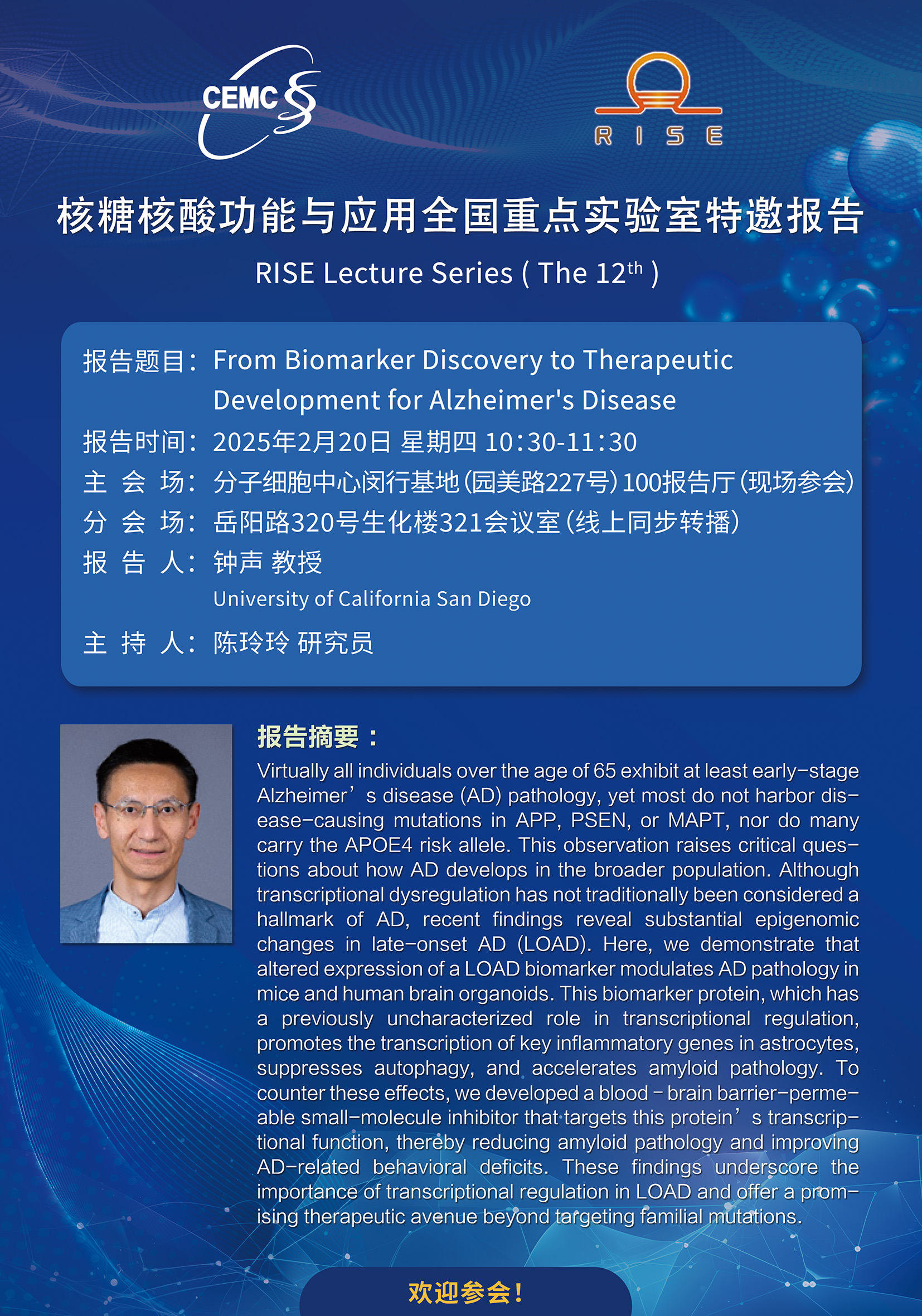 美國加州大學(xué)圣迭戈分校?鐘聲?教授:?From Biomarker Discovery to TherapeuticDevelopment for Alzheimer's Disease