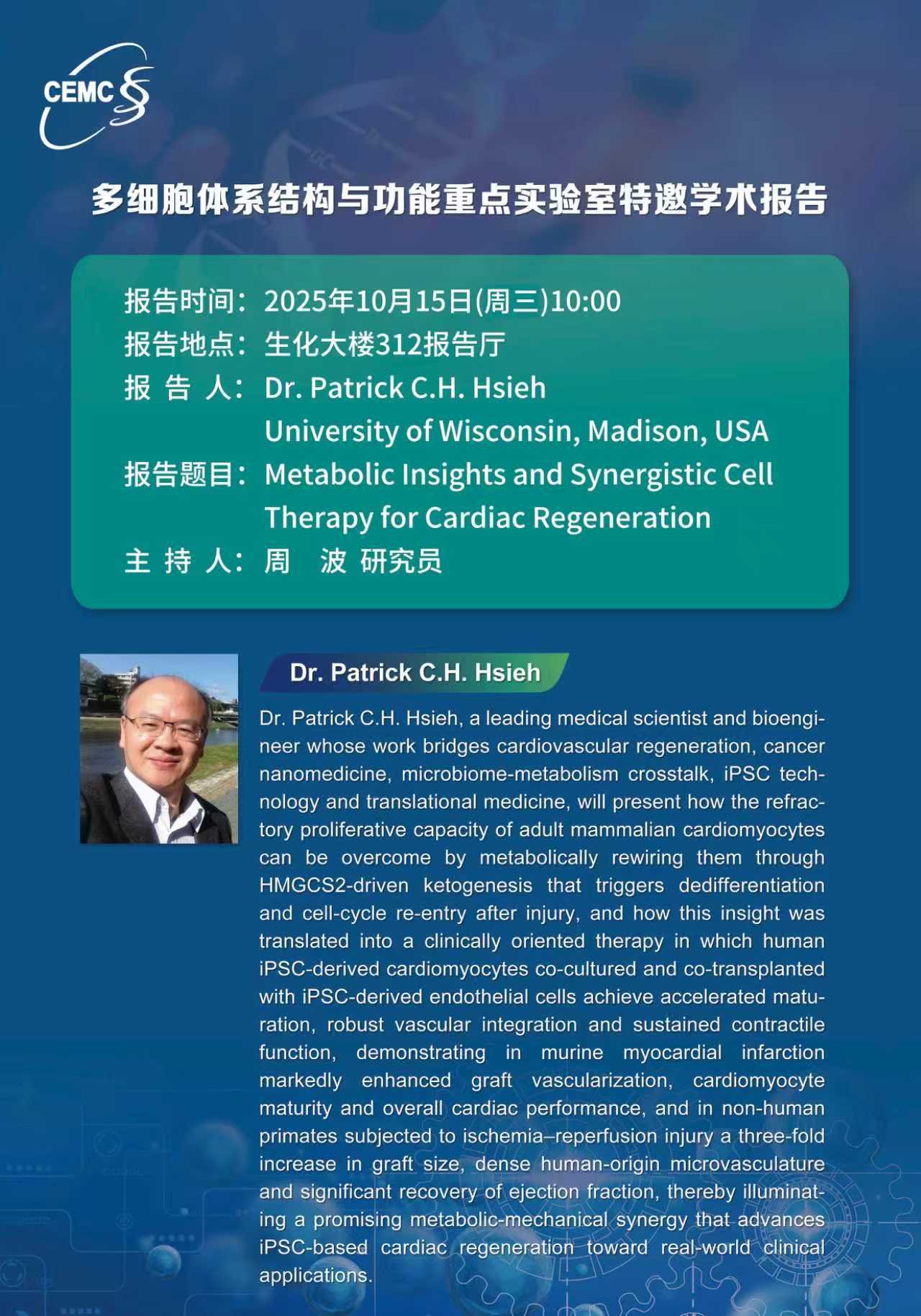 Prof.?Patrick?C.H.?Hsieh,?University of Wisconsin:?Metabolic?Insights and Synergistic Cell?Therapy for Cardiac Regeneration