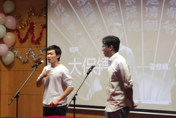 語(yǔ)言類節(jié)目金句頻出,歡聲笑語(yǔ)不斷。高云海同學(xué)朗誦的《未選擇的道路》將大家引入思考人生道路選擇的哲學(xué)深思之中。當(dāng)大家還在糾結(jié)選擇哪條“路”的時(shí)候,霍修楠、鄒龍昊同學(xué)帶來(lái)的《大保鏢》相聲節(jié)目又將晚會(huì)轉(zhuǎn)向輕松愉悅的氛圍,兩人幽默的語(yǔ)言、豐富的肢體動(dòng)作、意料之外的回答引得現(xiàn)場(chǎng)觀眾開(kāi)懷大笑。