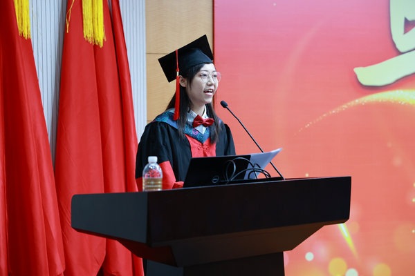 熊清平同學(xué)代表全體畢業(yè)生發(fā)言。她代表本屆全體畢業(yè)生向所有的師長們和親友們表示最真摯的感謝,并向大家分享了求學(xué)五年多以來令她印象深刻的時刻。她表示,在這里收獲了知識,收獲了師生情、友情和愛情,也更加清楚地認(rèn)識了自己。她希望同學(xué)們在今后面對失敗或困難時,能夠擁有戰(zhàn)勝它們的勇氣。作為當(dāng)代青年,要緊跟時代步伐,以青春之力,勇趕時代大潮,永遠(yuǎn)奔騰不息!