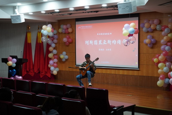 歌曲節(jié)目之外,古典吉他的琴聲也為晚會增添了別樣的迷人色彩,王行睿同學(xué)的吉他獨奏《阿斯圖里亞斯的傳奇》熱烈與沉靜結(jié)合,豪邁與婉轉(zhuǎn)相濟,向大家展現(xiàn)了這首《荷馬史詩》般的吉他名曲的魅力,讓全場觀眾都沉浸在悠揚的琴聲之中。