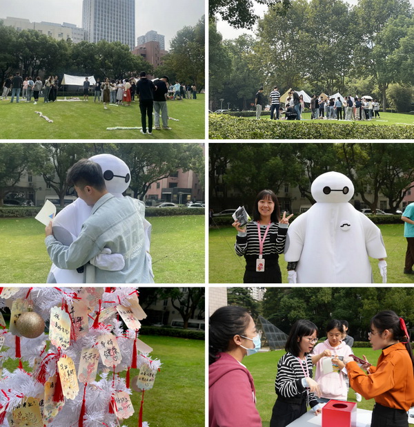 夏色漸斂,秋意漸濃。10月25日,同系列活動——“秋意滌心,和風(fēng)與你”游園會在中心新生化大樓前草坪成功舉辦。研究生會的同學(xué)們準(zhǔn)備了豐富的伴手禮,籌備了包含“組詞我最行”“emoji猜成語”“接力漢諾塔”“文章一投中”“黑暗中相遇”等戶外互動游戲項目,參與者通過打卡各個游戲獲得七巧板拼圖,最后根據(jù)拼圖總數(shù)兌換獎品。另外,還設(shè)置了暖心互動區(qū),在這里,大家可以擁抱大白人偶;在花樹上掛許愿卡片,留下金秋的第一個心愿。