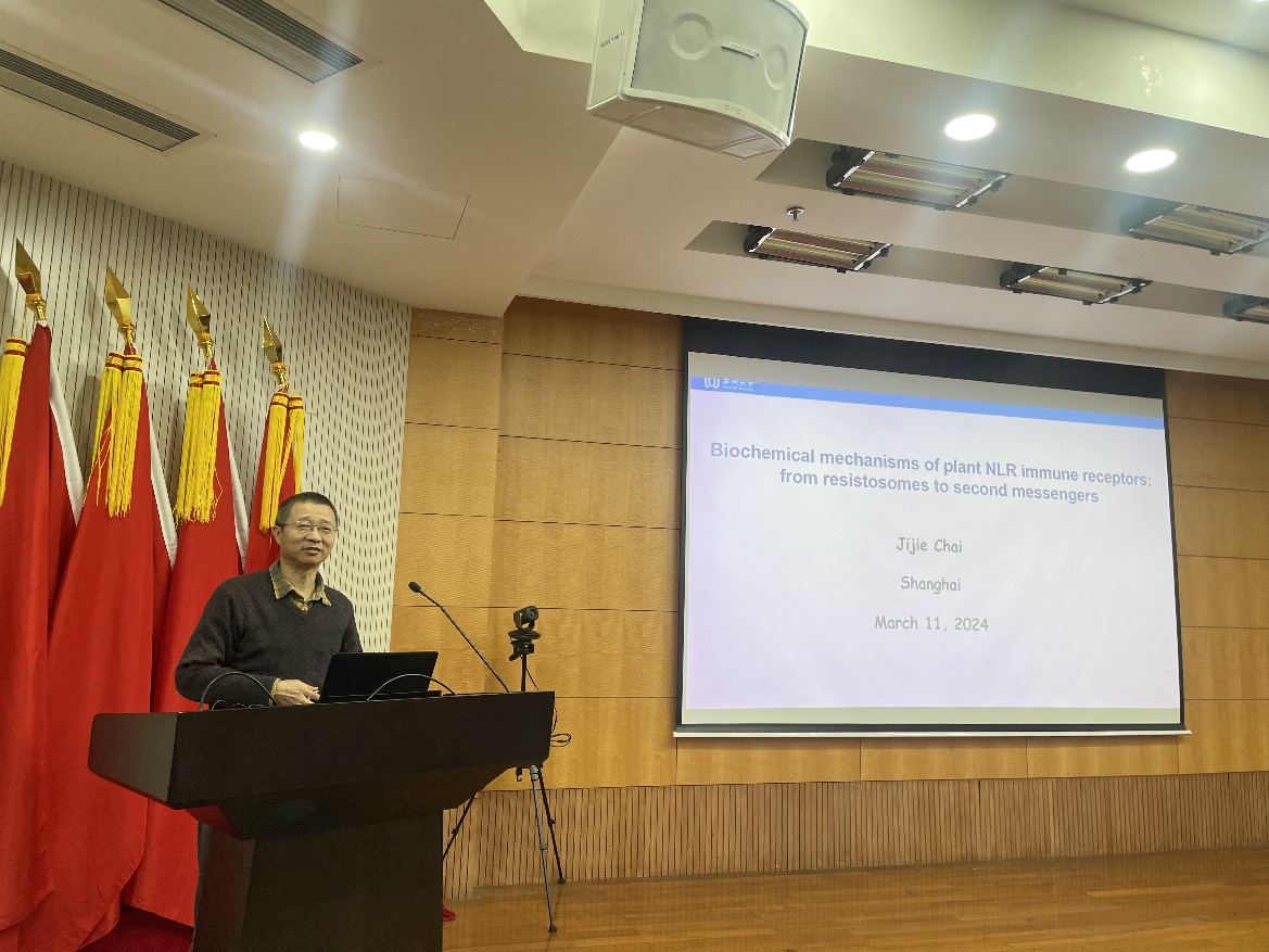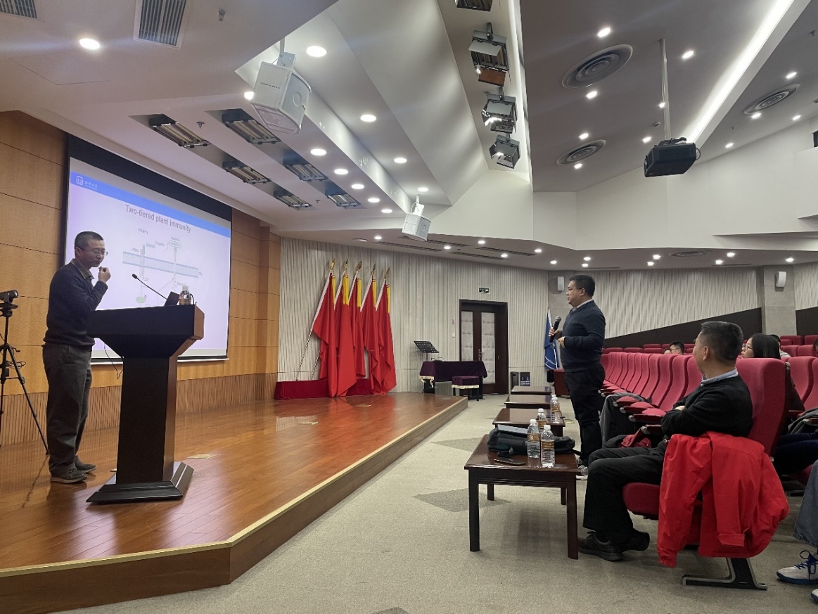柴繼杰作題為《植物免疫信號轉(zhuǎn)導(dǎo)機(jī)制》的報告。他從植物中介導(dǎo)先天免疫反應(yīng)的NOD樣受體蛋白NLR講起,詳細(xì)介紹了植物NLR發(fā)揮功能的分子機(jī)制。同時,他還結(jié)合自身30余年的科研經(jīng)歷,分享了自己選擇植物免疫作為研究方向的心路歷程,鼓勵同學(xué)們大膽做自己喜歡的研究。