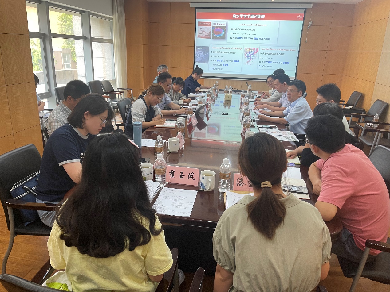 8月26日下午,上??茖W(xué)院科技發(fā)展部部長(zhǎng)李萬帶隊(duì)到分子細(xì)胞卓越中心調(diào)研。上海材料研究所有限公司期刊展覽事業(yè)部主任咸洋、上海科學(xué)院所屬期刊編輯部編輯等相關(guān)工作人員陪同調(diào)研。Cell Research/Cell Discovery主編李黨生,中心期刊編輯部主任及相關(guān)職能部門負(fù)責(zé)人參加調(diào)研座談會(huì)。會(huì)議由Cell Research/Cell Discovery編輯部主任程磊主持。