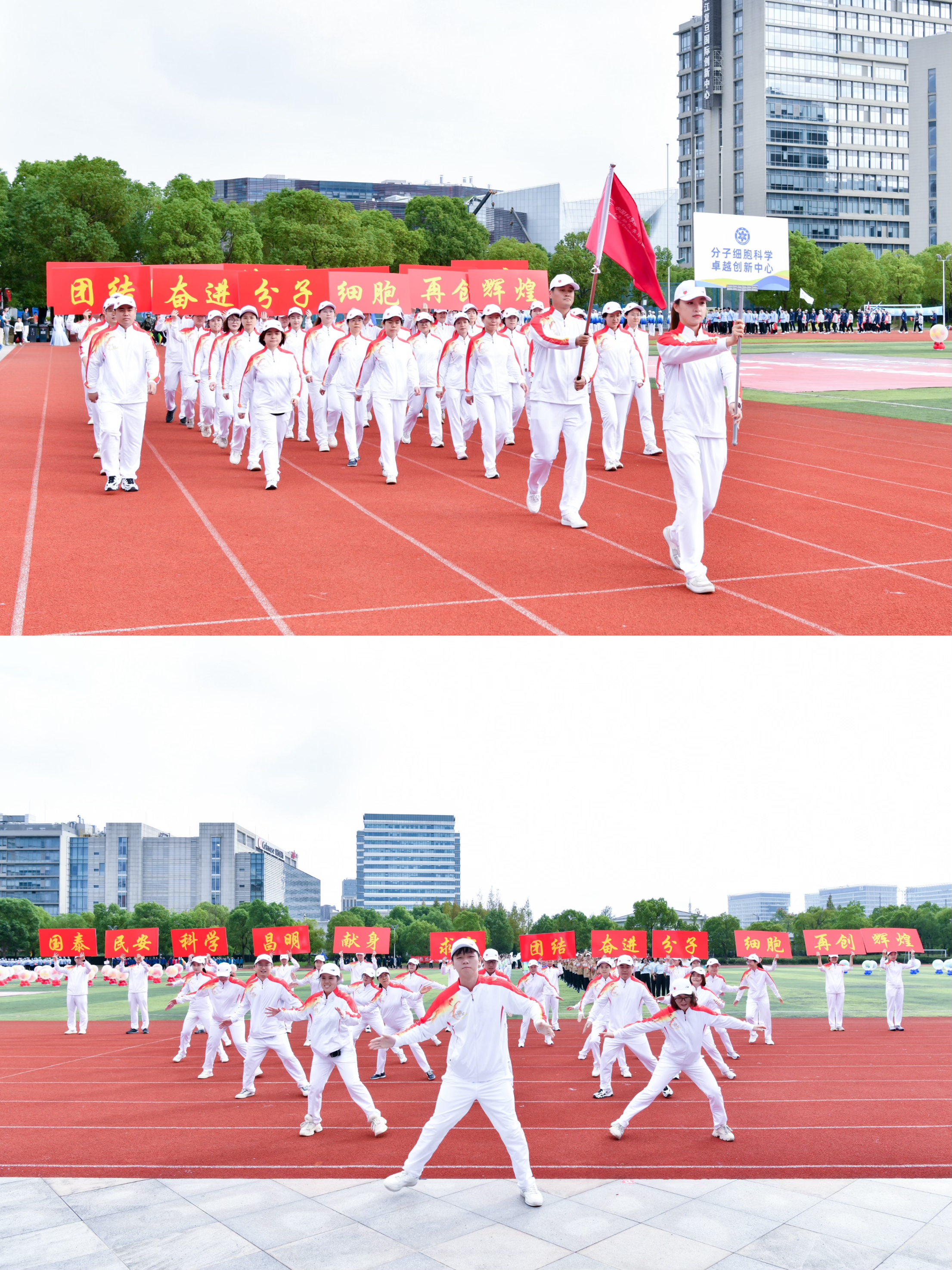 開幕式上,中心運(yùn)動(dòng)員方陣意氣風(fēng)發(fā),高喊著“獻(xiàn)身求實(shí)、團(tuán)結(jié)奮進(jìn)、分子細(xì)胞、再創(chuàng)輝煌”的口號(hào),邁著整齊劃一的步伐走向主席臺(tái),方陣立定后瞬間變換成金字塔隊(duì)形,展示了中心廣大師生員工勇攀科學(xué)高峰,搶占科技制高點(diǎn)的生動(dòng)形象,伴隨著《HandClap》動(dòng)感的節(jié)奏,運(yùn)動(dòng)員們揮舞手臂帶動(dòng)全場一起拍掌,將現(xiàn)場氣氛帶出一波小高潮。在千人Zumba展示環(huán)節(jié),運(yùn)動(dòng)員們充滿活力,體現(xiàn)了中心良好的精神風(fēng)貌。