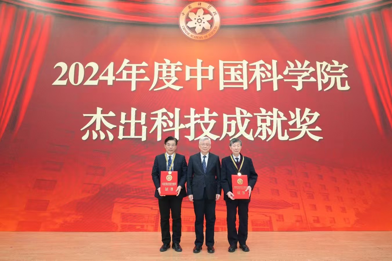 侯建國為獲得2024年度中國科學(xué)院杰出科技成就獎(jiǎng)個(gè)人成就獎(jiǎng)的陳立泉院士、陳仙輝院士頒獎(jiǎng)