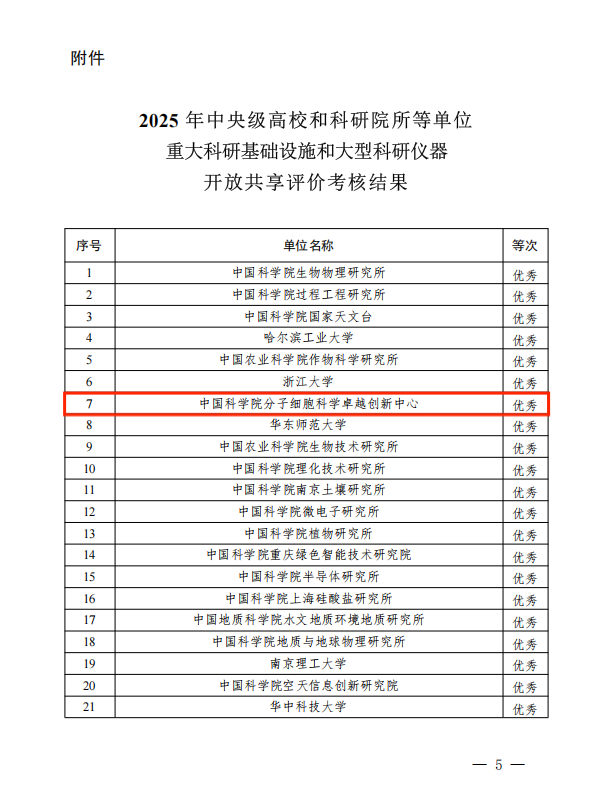 2025年10月10日,科技部辦公廳、財(cái)政部辦公廳發(fā)布了《關(guān)于發(fā)布2025年中央級(jí)高校和科研院所等單位重大科研基礎(chǔ)設(shè)施和大型科研儀器開(kāi)放共享評(píng)價(jià)考核結(jié)果的通知》(國(guó)科辦基〔2025〕107號(hào))。分子細(xì)胞卓越中心考核結(jié)果為“優(yōu)秀”。本年度共有26個(gè)部門(mén)344家單位參加評(píng)價(jià)考核,中心排名全國(guó)第七、中國(guó)科學(xué)院第四、上海市第一,這是中心自2018年來(lái)第7次在該項(xiàng)評(píng)價(jià)考核中獲得優(yōu)秀評(píng)級(jí)。