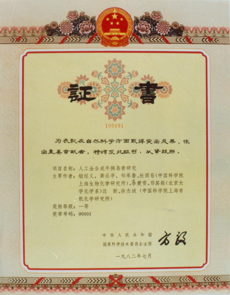 1982年國(guó)家自然科學(xué)一等獎(jiǎng)證書(shū)