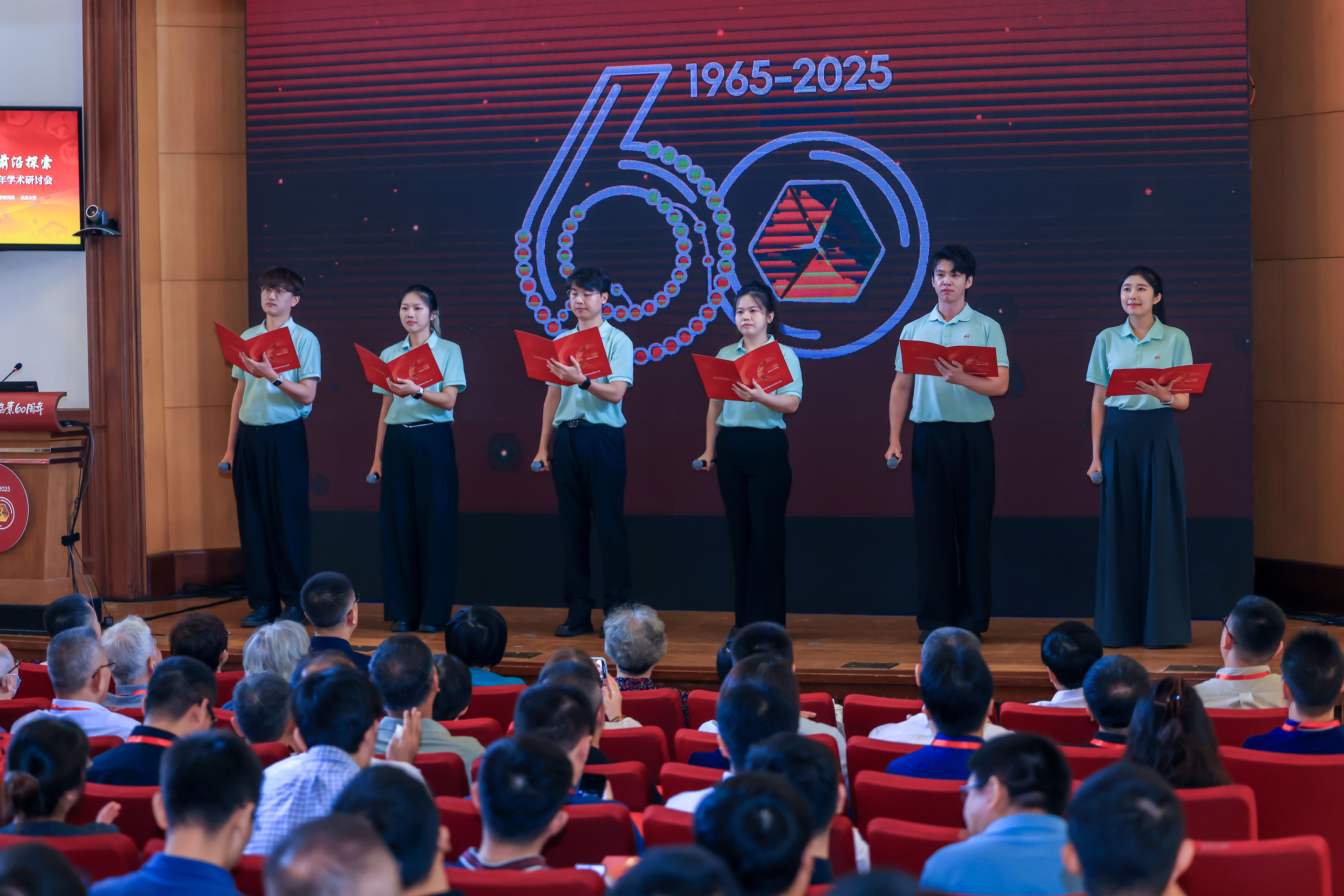 一甲子前的科學豐碑,照亮今天的科技攻堅路。大會現(xiàn)場,來自分子細胞卓越中心青年理論小組、團委、研究生會的青年科技工作者代表宋嘉文、高佳琪、梅自律、李榮耀、王尚宇、孔德慧以飽含深情的朗誦,將現(xiàn)場觀眾帶回了六十年前那段艱苦卓絕的歲月。一張張老照片將老一輩科學家的奮斗瞬間定格,一場跨越甲子的時空對話就此展開。在悠揚的配樂中,他們用青春之聲詮釋了“獻身、求實、團結(jié)、奮進”的胰島素精神,展現(xiàn)了青年一代承接榮光、續(xù)寫傳奇的堅定信念。